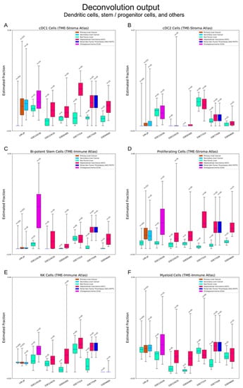 Deconvolution output—dendritic cells, stem/progenitor cells, and others. (A,B) Estimation of conventional dendritic cells (cDCs). Elevations of cDC1s can be seen in liver cancers. (C,D) Estimation of two types of proliferative cells. Bi-potent stem cells are a group of late-stage pluripotent cells with potential to differentiate into hepatocytes and cholangiocytes. The TME-Stroma atlas did not clarify the exact characteristics of proliferating cells. Its signature genes suggest its pluripotent origin. Elevations of these two cell types can be seen in liver cancers. (E,F) Estimation of natural killer (NK) cells and myeloid cells. NK cells belong to innate immune branch and myeloid cells are the hematopoiesis-originated immune branch. Deconvolution of these two cell types shows altered activities in liver cancers, but no direct association can be drawn.