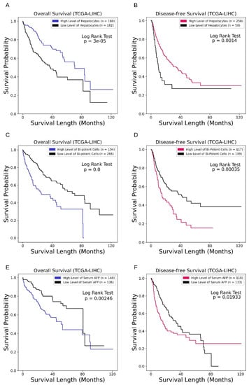 Among all the estimated cell types, hepatocytes and bi-potent cells show substantial impacts on patients’ outcomes. The estimated fractions of hepatocytes show a sigmoid-shaped distribution. The optimisation strategy (lowest log-rank test p-value) separates the cohort at a close-to-median point in OS analysis, and at an inflection point for DFS analysis (Figure 7C). High fractions of hepatocytes are associated with longer OS and DFS (Figure 7A,B). Estimated fractions of bi-potent cells show exponential distribution. The optimisation strategy isolated a subset with the cell fractions close to zero (Figure 7F). Those with high fractions of bi-potent cells show lower OS and DFS (Figure 7D,E). TCGA also included serum alpha–fetoprotein (AFP) at patient admission. Although the differences of OS and DFS between patients with high- or low-level AFP reach statistical significance, crossings of KM curves exist. In contrast, deconvoluted hepatocytes and bi-potent cells show better discrimination (Figure 7).