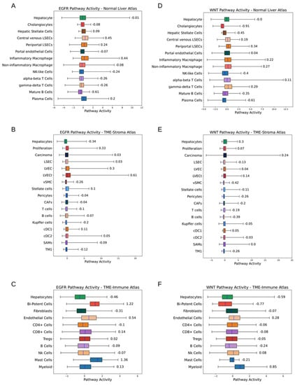 Pathway activities of cell types in the three atlases (estimated by PROGENy). (A–C) EGFR activities. Central venous LSECs, inflammatory macrophages, LVECt, bi-potent cells, mast cells, etc., are EGFR active, suggesting the involvement in angiogenesis, immune responses, and proliferation. (D–F) WNT activities. Periportal LSECs, inflammatory and non-inflammatory macrophages, gamma-delta T cells, hepatocytes (TME-Strom), carcinoma cells (TME-Stroma), myeloid cells, etc., are WNT active, suggesting the involvement in immune activities.