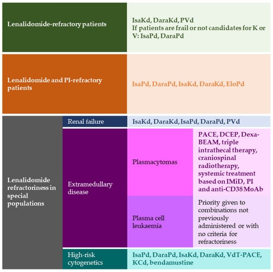 Refractoriness to lenalidomide, PI and anti-CD38 MoAb in the early stages of MM is a recent situation that has not been explored specifically in clinical trials. Similar to other conditions, and given the lack of evidence, the decision to treat in these cases is determined by the patient’s situation and comorbidities, prior therapies, and any restrictions the centre may have on obtaining certain drug combinations. A valid option is to avoid administering lenalidomide and anti-CD38 MoAb in favour of regimens such as Kd (especially in patients with good overall status and no cardiovascular risk factors), which achieved an mPFS of 15.2 months in a study that included 36% of lenalidomide-refractory patients, or PVd [,]. To improve these results, three studies added cyclophosphamide (KCd [], phase 2) or pomalidomide (KPd [,], phase 1-1/2) to the combination. Although these regimens have not yet been approved, they have shown an mPFS of 20.7 months in the KCd trial [] and 7.2 months [] and 10.3 months [] in the two trials with the KPd combination. Noteworthy, all patients in the KPd phase 1 trial were lenalidomide-refractory.