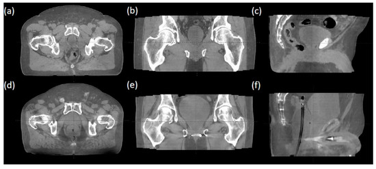 Each fraction’s iCBCT was taken prior to treatment for target localization using an On-Board Imager ® (Varian Medical Systems, Palo Alto, CA, USA) with a Pelvis Imaging mode setting (125 kVp, 1080 mAs, 900 projections, and 46.5 cm field of view) and Acuros CTS-based iterative reconstruction algorithm [21,22]. Upon confirming bladder filling by daily iCBCT, therapists then performed an automatic image registration between the planning CT and iCBCT with six degrees of freedom for couch turned on, followed by manual fine-tuning based on the rectum and bladder interfaces in axial, sagittal, and coronal views. Figure 1 provides an example of image registration accuracy using iCBCT compared to the planning CT. The rectal wall and bladder interface and the prostate bed from the obturator internus musculature in patients can be clearly differentiated on the iCBCT with and without an endorectal balloon. This soft tissue contrast quality allows therapists to accurately align the patient without seeing a solid target in a post-prostatectomy setting with clear IGRT matching instructions. Figure 2 demonstrates axial, coronal, and sagittal iCBCT reconstruction of a patient without endorectal balloon (Figure 2a–c) and with endorectal balloon (Figure 2d–f).