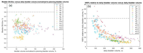 (a) Maximum bladder dose (0.03 mL) versus daily bladder volume. Maximum accepted D0.03mL of 108% is indicated with dashed black line. (b) V65% relative to daily bladder volume versus daily bladder volume. Constraint of V65% <60% is indicated by the dashed black line. Patients 1–6 (circle) use no endorectal balloons. Patients 7–14 (crosses) use endorectal balloons.