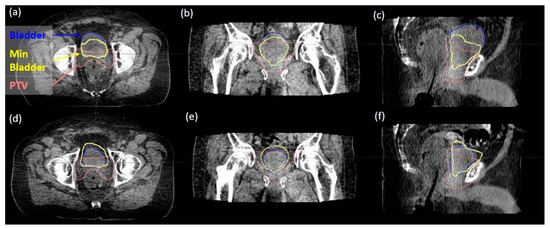(a–c) an example of a daily bladder volume that passed the V65% >60% constraint. The bladder (blue) extends anteriorly and superiorly beyond the “minimum bladder” contour (yellow). (d–f) An example of a daily bladder volume that failed the V65% >60% constraint. The bladder does not completely extend anteriorly and superiorly beyond the “minimum bladder” contour.