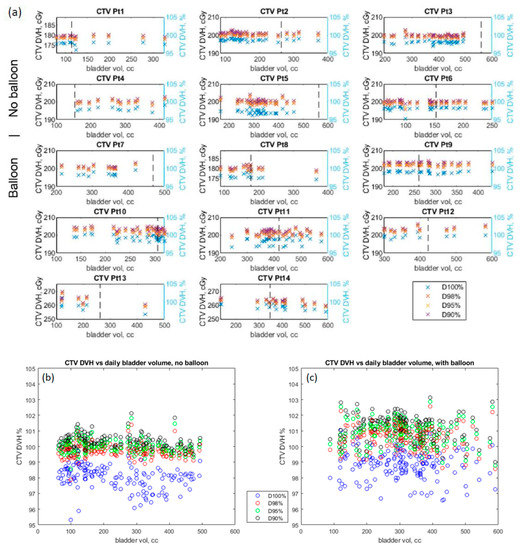 (a) CTV coverage for each patient as a function of daily bladder volume. The dashed black line indicates the planning bladder volume. CTV coverage as a function of daily bladder volume for patients without endorectal balloon (b) and with endorectal balloon (c).