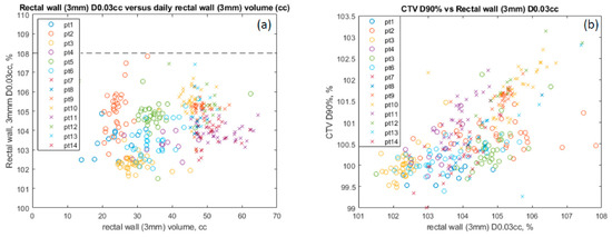 Table 1 provides statistical analysis showing that the median change in the bladder V65 was −0.00084% (p < 0.0001). With the ERB, the rectal V45 is higher by 10.3 cGy (p < 0.001). The daily change in bladder volume resulted in a median change in the CTV D90% of 0.0037 cGy (p = 0.006) and in the CTV D95% of −0.0017 cGy (p = 0.027), which is clinically not significant. Figure 5a demonstrates consistent CTV coverage (D90%, D95%, and D98%) by patient, despite the large bladder volume variation and with (Pt 7–14) or without (Pt 1–6) an ERB. The dashed vertical line in each figure shows the initial bladder volume at simulation. CTVs (D90%, D95%, and D98%) stayed consistently covered with a range of 95% to 103% for all patients over all the fractions regardless of the absolute bladder volume daily variation, no balloon (Figure 5b) or with an endorectal balloon (Figure 4c). Patients with an ERB had a median dose increase of 1.61 cGy and 1.54 cGy in CTV D90% and D95% (p < 0.001), respectively. Patients with balloons (crosses) had a smaller variation but a higher average maximum rectal wall dose (D0.03mL: 104.3% of the prescription) compared to patients without (103.3%) (circles) (Figure 6a). All rectal wall maximum doses (D0.03mL) met the dose constraints (<108% of the prescription) regardless of the rectal wall volume, or the use of ERBs. Figure 6b shows the CTV D90% coverage with respect to the maximum wall doses, with or without an ERB, also indicating higher rectal wall doses with ERB (crosses).