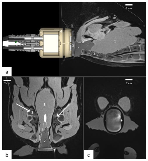Positioning of the phased-array transducer on carcass lamb: (a) sagittal, (b) coronal and (c) axial sections in the T1w 3D GRE data. Transducer (4) was placed in the axis of the simulated target (1), the coupling between the target and the transducer was realized with standard ultrasonic gel (2) and the water flow compartment in front of the applicator (5). A special attention was paid to thermal energy deposition on bone (3) that is indicated with white arrows.