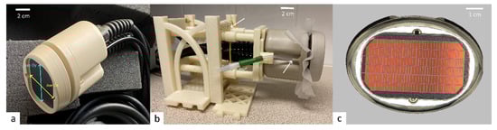 The novel hyperthermia transducer for prostate cancer. (a) Transperineal phased array transducer; (b) customized 3D printed holder and water circuit (white arrows); (c) padding of the active surface with acoustic elements.
