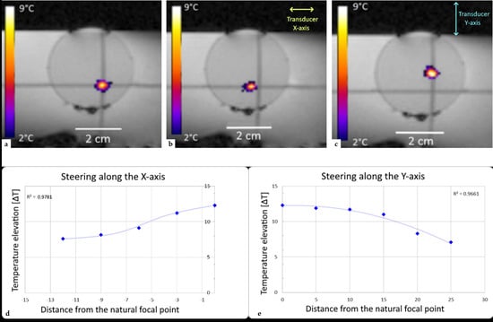 Study of steering capacities in the X and Y axes. (a) Sonication at the symmetry axis (b) sonication with steering of 8mm in the X-axis, and (c) sonication with steering of 15 mm in the Y-axis. (d,e) Tables of steering capacities.