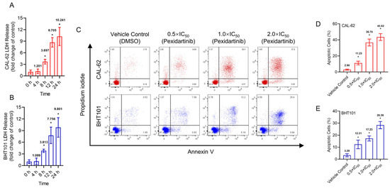 Pexidartinib potently induced the LDH release in both CAL-62 and BHT101 cells, the earliest significant change of LDH in both cells was at 8 h (Figure 2C–E). To identify the possible mechanisms of pexidartinib-induced ATC cell death, apoptotic cells were detected after pexidartinib administration. After incubation with increasing concentrations of pexidartinib, the cell dots in the second and third quadrant obviously increased, and the statistical analysis indicated that pexidartinib significantly induced apoptosis in CAL-62 and BHT101 cells dependent upon concentration (Figure 2C–E). The apoptotic-related proteins were also evaluated. As shown in Figure 2F,G, cleaved PARP and caspase-3 increased after administration with various doses of pexidartinib in both CAL-62 and BHT101 cells. In addition, the expression level of Bax, a representative pro-apoptotic molecule, significantly increased, while Bcl-2, an anti-apoptotic protein, potently decreased under pexidartinib treatment. As shown in Figure 2H,I, pexidartinib significantly upregulated the activity of caspase-3 in both CAL-62 and BHT101 cells dose-dependently.