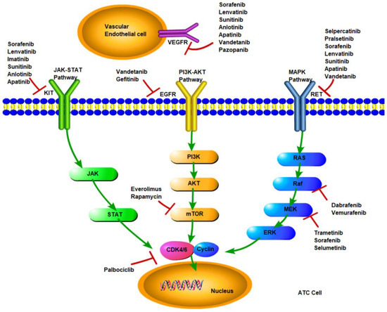 The signaling pathways in ATC mainly involve MAPK, PI3K/AKT/mTOR, and JAK-STAT, which include important targets such as RET, EGRF, and KIT, as shown in Figure 1. Mutation of a target deranges downstream signaling, leading to dysregulation of cell growth and apoptosis and, ultimately, cancer development. Targeted therapy has become a highly valued treatment, which inhibits the abnormal proliferation of malignant cells by blocking specific signaling pathways.