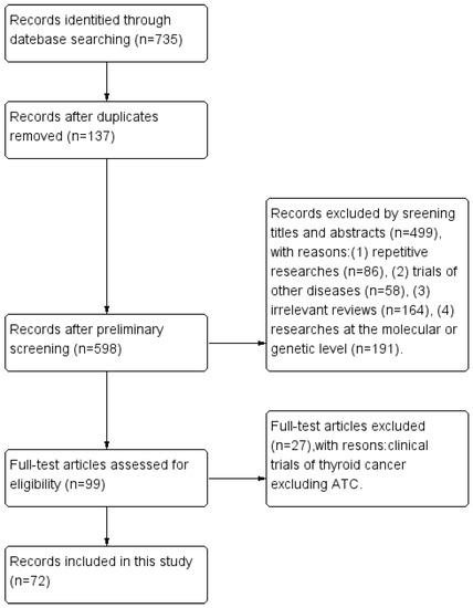 The search identified 735 references in total. After screening, 663 studies were discarded, leaving 72 studies finally [7,8,9,10,11,12,13,14,15,16,17,18,19,20,21,22,23,24,25,26,27,28,29,30,31,32,33,34,35,36,37,38,39,40,41,42,43,44,45,46,47,48,49,50,51,52,53,54,55,56,57,58,59,60,61,62,63,64,65,66,67,68,69,70,71,72,73,74,75,76,77,78], detailed in Figure 2. These original papers were read carefully, the relevant studies were reviewed, and information was extracted and compiled from the literature. We focused on the relevant clinical trial data to summarize statistics on the clinical efficacy and AEs of multiple targeted agents for ATC patients. For promising targeted drugs that have not been studied clinically, we discussed them mainly from existing in vitro and in vivo trials.