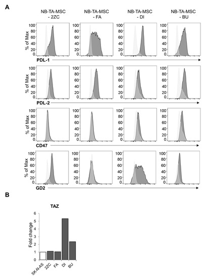 Interestingly, all the tested NB-TA-MSCs express the checkpoint ligands PD-L1 and PD-L2. The macrophage checkpoint CD47, delivering the “do not eat me” signal [30], is expressed by DI and BU but not by 2ZC and FA. GD2, is a marker typical of neoplastic neuroblasts that is a target for immunotherapy protocols [31]. It is expressed by NB-TMSC with the exception of FA (Figure 1A). We also found that NB-TA-MSCs express the mesenchymal immunomodulatory transcriptional coactivator WWTR1 (alias TAZ; Figure 1B). Finally, these cells also display high levels of the immunomodulatory molecule MHC-1.