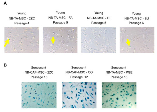 Staining with the senescence-associated beta-galactosidase (SA-β-gal) assay of young/proliferative and growth-arrested NB-TA-MSC. (A) Representative images of young/proliferating NB-TA-MSC and (B) Growth-arrested NB-TA-MSC stained with SA-β-gal at the indicated culture passages. The senescent cells appear stained in blue. Images represent 10× with phase contrast optical microscope of n = 3 independent experiments. Yellow arrows indicate rare β-gal+ cells in young proliferating NB-TA-MSC cells.