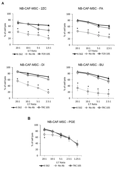 Subsequently, we investigated whether NB-TA-MSC cells interfered with the cytolytic potential of NK cells. First, we analyzed the cytolytic activity of activated NK (aNK) cells against four NB-TA-MSC primary cultures in 4 h co-culture assays. As shown in Figure 3A, low passage proliferating NB-TA-MSC cell lines are highly resistant to aNK cell lysis, while senescent PGE (Figure 3B) are highly sensitive to aNK cell lysis. The aNK-mediated cell lysis of proliferating NB-TA-MSC primary cultures is improved in the presence of the CD105 IgG1 monoclonal antibody TRC105, which activates ADCC (Figure 3).