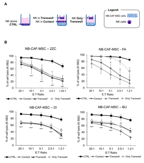 Evaluation of NK cell cytotoxic activity after co-culture with primary NB-TA-MSC. (A) Schematic representation of cells seeded in co-culture experiments. Freshly isolated NK cells were cultured in the upper chamber for 6 days with NB-TA-MSC cells in the lower chamber (Only Transwell) or a setting with NK cells in the upper chamber (NK Transwell) and NB-TA-MSC with NK cells in the lower chamber (Contact). NK cultured alone were used as the control (CTRL). (B) NK cell cytotoxicity assays against CMFDA-labelled K-562 cells after co-culture with young/proliferating NB-TA-2ZC, FA, DI and BU primary cultures under direct cell–cell contact (Contact) or under Transwell conditions (Transwell and Only Transwell). NK cultured alone were used as a control (CTRL). Percentages of cell lysis (CMFDA+ and PI+ cells) were expressed as mean ±SD (n = 4). * p < 0.05 Contact vs. CTRL. ^ p < 0.05 Transwell vs. CTRL ° p < 0.05 Only Transwell vs. CTRL.