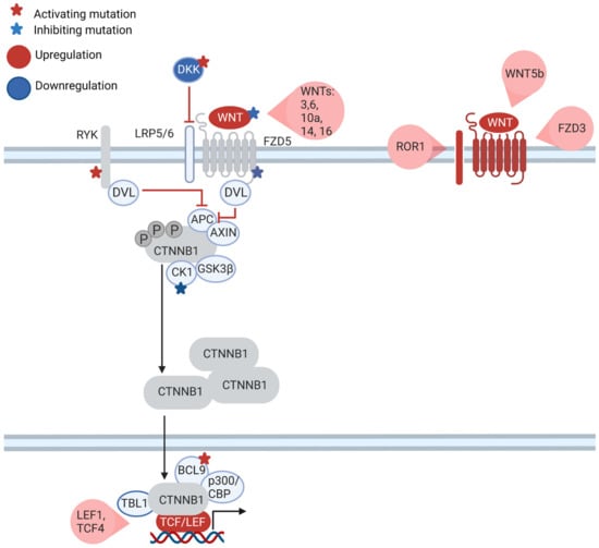 - Wang, L. Somatic mutation as a mechanism of Wnt/β-catenin pathway activation in CLL. Blood 2014, 124, 1089–1098. [Google Scholar] [CrossRef] [PubMed]