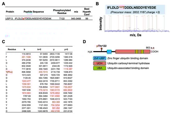 Identification of new phosphorylation site on USP13. (A) USP13 phosphorylation site identified by LC-MS/MS in HeyA8 ovarian cancer cells. Peptide sequence, phosphorylation residue, mass-to-charge ratio (m/z), and best hypothesis configuration are indicated. (B) MS/MS spectrum of IFLDLDTDDDLNSDDYEYEDE peptide with phosphorylation at Thr122 with ions (b = green, y = red). Both b-type and y-type ions were labeled to determine the peptide sequence of the precursor ion and to locate the sites of phosphorylation. (C) Matched b-type and y-type ions are shown in red, with phosphorylation at Thr122 unambiguously assigned. b-ions: the charge is retained by the amino-terminal part of the peptide. y-ions: the charge is retained by the carboxyl-terminal part of the peptide. (D) USP13 domain structure and Threonine 122 (Thr122) phosphorylation site. Thr122 is located at the N-terminal of USP13 protein, but not in the conserved functional domains.