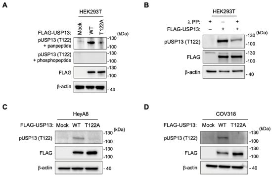 USP13 is phosphorylated at Thr122 in human HEK293T and ovarian cancer cells. (A) Analysis of anti-pT122 antibody specificity using peptide competition assay on western blotting (WB) (B) WB analysis of HEK293T cells transfected with FLAG-USP13 and preincubated with or without λ-phosphatase as indicated. FLAG-tagged wild-type USP13 (WT) or FLAG-tagged phospho-mutant USP13 (T122A) was transfected into HeyA8 (C) and COV318 (D) ovarian cancer cells. WB measured the levels of pT122 and FLAG-USP13. β-Actin was used as a loading control.