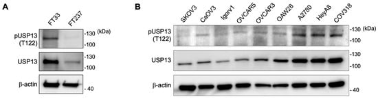 We overexpressed FLAG-tagged wild-type USP13 (WT) and phospho-mutant USP13 (T122A) in two human ovarian cancer cell lines. The anti-pT122 antibody specifically detected a phosphorylated USP13 in HeyA8 and COV318 expressing wild-type USP13, not T122A mutant USP13 (Figure 2C,D). Next, we examined the phosphorylated Thr122 (pT122) on endogenous USP13 in immortalized human fallopian tube secretory epithelial cells and various human ovarian cancer cell lines with the validated anti-pT122 antibody. We observed that USP13 is phosphorylated at Thr122 residue in the human fallopian tube epithelial cells (Figure 3A). Thr122 phosphorylation was observed in most ovarian cancer cell lines (Figure 3B). The pT122 level was variable across different ovarian cancer cell lines. The abundance of the phosphorylated form (pT122) of USP13 was correlated to the total level of USP13 in most ovarian cancer cells.