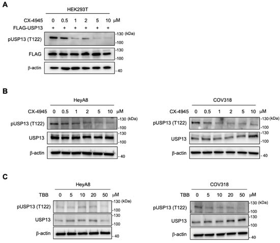 We then addressed whether CK2 phosphorylates USP13 in the cellular context by inhibiting CK2 kinase activity in cells with CK2 inhibitors, silmitasertib (CX-4945) and 4,5,6,7-tetrabromobenzotriazole (TBB) [33,34,35]. We first determined an effective dose of the inhibitor by treating HEK293T cells expressing FLAG-tagged USP13 with increasing concentration of CX-4945. Cell lysates were prepared the following day and immunoblotted with an anti-pT122 antibody. The treatment with CK2 inhibitor (CX-4945) dramatically reduced the signal of Thr122 phosphorylation of USP13 in HEK293T cells (Figure 5A). The result indicated significant inhibition of USP13 phosphorylation on Thr122 at a concentration from 1 µM of CX-4945. Next, two ovarian cancer cells (HeyA8 and COV318) were treated with CX-4945 for 24 h and TBB for 48 h. Both CK2 inhibitors successfully decreased the abundance of Thr122 phosphorylation in ovarian cancer cells (Figure 5B,C). CX-4945 (0.5–1 µM) more effectively decreased Thr122 phosphorylation in both cell lines, while TBB was effective at 5–50 µM concentrations.