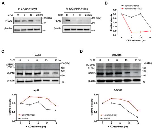 The phosphorylation at Thr122 of USP13 could result in various effects on USP13. We examined if the phosphorylation of Thr122 affects the stability of USP13. HEK293T cells were transfected with FLAG-tagged wild-type USP13 (WT) or FLAG-tagged phospho-mutant USP13 (T122A) and then treated with 100 µg/mL of cycloheximide (CHX). In CHX chase assays, the exogenously expressed wild-type of USP13 was stable over 16 h. However, the phospho-mutant of USP13 (T122A) showed a significantly down-regulated half-life time in HEK293T cells (Figure 6A,B). Next, we measured the endogenous levels of total USP13 and phosphorylated USP13 (pT122) in HeyA8 and COV318 cells in the presence of 100 µg/mL CHX. CHX chase assay revealed that the phosphorylated USP13 at Thr122 was more stable than the total USP13 in ovarian cancer cells (Figure 6C,D). Altogether, these data suggest that phosphorylation at the T122 residue of USP13 increases the protein stability of USP13.