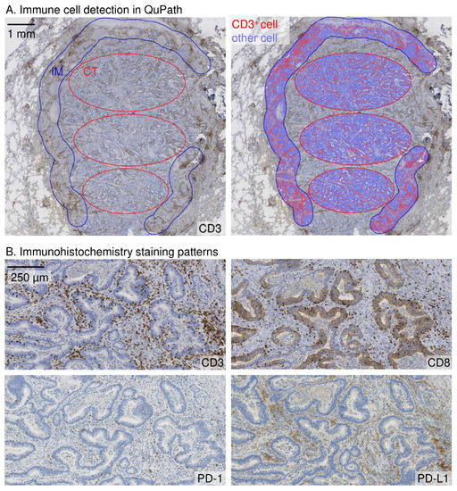 PD-1/PD-L1 expression is also a predictor for immune checkpoint inhibitor treatment response in several cancers [19]. In CRC, immune checkpoint inhibitor treatment has promising results in MMR deficient (dMMR) patients [20], while in MMR proficient (pMMR) CRC patients, the response rates are low [21,22]. Interestingly, in early-stage pMMR colon cancer patients, high CD8+PD-1+ T cell infiltration in preoperative biopsies was a predictive factor for neoadjuvant immune checkpoint inhibitor treatment response [23] suggesting that a possible sub-group for immune checkpoint inhibitor treatment in pMMR CRC patients might lie in those with high T-cell infiltration.