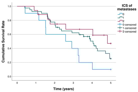 The 5-year survival of the first pulmonary metastasectomy stratified by low, intermediate, and high ICS of the pulmonary metastases are shown in Figure 3. The 5-year overall survival rates in ICS patient groups were 10.0%, 25.5% and 47.0% (p = 0.046) (Table 2). The overall 5-year survival was significantly better in the high and intermediate ICS groups compared to the low ICS group (high vs. low adjusted HR 0.25, 95% CI 0.09–0.75, p = 0.013; intermediate vs. low adjusted HR 0.31, 95% CI 0.13–0.74; p = 0.008; Table 3).