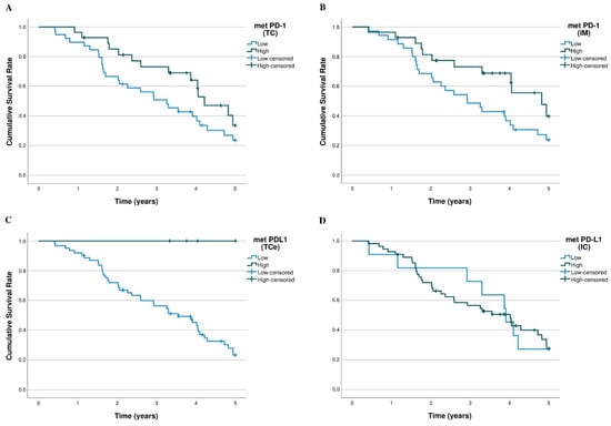 K-M 5-year overall survival curves of PD-1/PD-L1 expression in pulmonary metastases. (A) PD-1 expression (n = 67) in the tumour centre (p = 0.114). (B) PD-1 expression (n = 63) in the invasive margin (p = 0.066). (C) PD-L1 expression (n = 67) in the tumour cells (p = 0.024). (D) PD-L1 expression (n = 66) in the tumour infiltrating immune cells (p = 0.943).