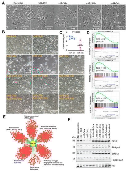 miRNAs are short ~22 nucleotide noncoding RNAs that are sequentially processed from primary transcripts (pri-miRNA) by Drosha in the nucleus and then by Dicer in the cytoplasm, thereby complexing with an RNA induced silencing complex (RISC) to modulate the stability and/or translation of their mRNA targets [50,51]. miRNAs are predicted to target at least 50% of mammalian protein-coding genes, indicating that they are involved in the regulation of a variety of cellular processes. miRNAs are widely deregulated in cancer and other diseases [50,51]. One genetic feature of neuroblastoma is loss of heterozygosity (LOH) of chromosome 1p36 or 11q23, which bears miR-34a and miR-34b/c, respectively. miR-34 is well known to possess anti-tumor functions by antagonizing oncogenes [52]. As miRNA is usually wired into a network and regulates multiple genes that are interconnected within pathways or cellular processes, we surmised that the identification of a gene network of cancer-associated miRNAs may provide an opportunity to design combined therapy by targeting the interconnected molecules. We therefore started with identification of the miR-34-targeted gene network in neuroblastoma cells. First, we verified that miR-34 was tumor suppressive in neuroblastoma cells by transfecting the three individual miR-34s into BE2C cells, a commonly used neuroblastoma cell line with MYCN amplification. miR-34 expression resulted in dramatic cellular differentiation, as evidenced by neurite outgrowth (Figure 1A,B). These results were consistent with previous studies showing that miR-34a has antitumor activity [53,54]. We further showed that lentiviral-mediated overexpression of miR-34b significantly reduced tumor burden in CB17 SCID mice (Figure 1C), which validated the tumor suppressive functions of miR-34 paralogs. The cellular phenotype induced by miR-34 was specific as anti-miR-34 substantially rescued the miR-34-induced differentiation and cell survival (Figure 1B). Then, we performed global gene expression profile analysis after transfecting miR-34 into BE2C cells. The three miR-34s induced expression changes (>2-fold) in numerous genes (Table S1). Although a substantial number of different genes were specifically induced by individual miRNAs, the majority of targets were commonly affected by the three miR-34s (Table S2). Gene set enrichment analysis revealed that the genes downregulated by miR-34 were most significantly enriched with miR-34 targets (Figure 1D), demonstrating the transfected miR34 hit targets in cells. Next, we used the genes commonly downregulated by miR-34s as a gene signature for a molecular concept analysis to mine the functional association between miR-34 targets and other gene signatures and pathways (including literature-based concepts, genetic perturbation, molecular mutation, clinical outcome, disease recurrence and metastasis, pathological subtypes). We found that genes affected by miR-34 were significantly associated with signatures of advanced neuroblastoma, p53 mutation, 1p36 LOH in neuroblastoma, poor clinical outcome, recurrent disease and metastasis, and target genes of PRC2 (EZH2, SUZ12) components (Figure 1E), suggesting that miR-34 is engaged in regulating a variety of pathways including EZH2 target genes. Anti-miR-34 rescued the expression of PRC2 components (Figure 1F), further validating the specificity of miR-34 in regulating PRC2 complex.