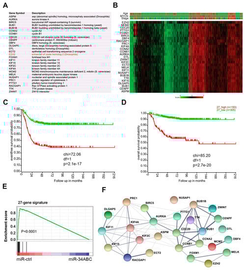 The EZH2 correlated 27-gene signature is targets of miR-34 and associated with poor outcomes of neuroblastoma. (A) The 27 genes whose expression are significantly correlated with EZH2 across multiple solid cancers. (B) Heatmap shows the 27 genes in neuroblastoma dataset (GSE45547) that contained 649 samples. Age (red > 18 months; green < 18 months); MYCN (red = amplification; green = non-amplification); stage (red = stage 4; blue = stage 4S; brown = stage 3; dark green = stage 2, green = stage 1). Scale bar indicates the expression score. (C) Kaplan–Meier analysis shows that the 27-gene signature is associated with poor event-free outcome in patients with neuroblastoma from dataset (GSE62564) that contained 498 samples. (D) Kaplan–Meier analysis shows that the 27-gene signature is associated with overall survival in patients with neuroblastoma from dataset (GSE62564) that contained 498 samples. (E) Gene set–enrichment analysis shows that miR-34 targets the 27-gene signature in neuroblastoma cells. (F) Protein–protein interaction network of the 27-gene signature encoding proteins analyzed by STRING program.