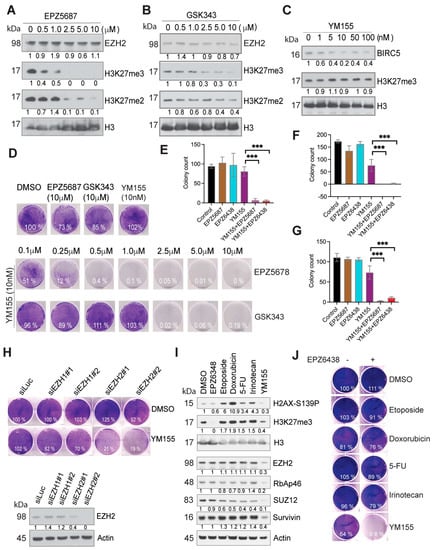 Synthetic lethality induced by EZH2 inhibitors and YM155. (A–C) Western blotting assessment of the markers with indicated antibodies. BE2C cells were treated with EZH2 inhibitor EPZ5687 (A), GSK343 (B) or BIRC5 inhibitor YM155 (C) with indicated concentrations for 24 h. (D) EZH2 inhibitors EPZ5687 or GSK343 at different concentrations in combination with 10 nM of YM155 for treatment of BE2C cells for 3 days. Cells were stained with crystal violet. (E–G) Colony quantification for BE2C (E), KELLY (F) and SKNDZ (G) cells treated with 10nM of YM155 (crystal violet staining in Figure S2F), and/or 5 μM of EPZ5687, 2.5 μM of EPZ6438 for 48 h, then replenished fresh media for additional 7 days. Unpaired t test is used to compare YM155 with the combinations. *** p < 0.01. (H) After siRNA knockdown of EZH1 and EZH2 in BE2C cells, Western blotting was used to assess the EZH2 expression (bottom panel). Crystal violet was used to stain the cells after siRNA knockdown of EZH1 or EZH2 followed by 3 days’ treatment of 10 nM of YM155. (I) Western blot for indicated markers after 24 h treatment of EPZ6438 (5 μM), Etoposide (0.5 μM), Doxorubicin (0.5 μg/mL), 5-FU (0.5 μM), Irinotecan (2.5 μM), YM155 (10 nM) (right panel). (J) Crystal violet was used to stain the cells after 48 h treatment with indicated agents (left panel). Colony intensity was quantified by ImageJ and normalized to DMSO control.