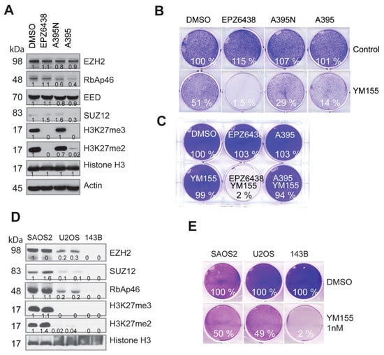 The synthetic lethality induced by EZH2 inhibitors with YM155 is independent of PRC2-mediated H3K27 methylation. (A) Western blot analysis for PRC2 and H3K27me3/me2 after a 48 h treatment of BE2C cells with the EZH2 inhibitor EPZ6438 (5 µM), EED inhibitor A395 (1 µM), and A395N (1 µM), the inactive analog of A395. (B) Cell-colony formation after 36 h treatment with EPZ6438 (5 µM), A395 (1 µM), A395N (1 µM), or YM155 (10 nM), and their combinations. (C) Cell-colony formation of BE2C cells after 24 h treatment from another independent experiment (EPZ6438 = 5 µM, A395 = 1 µM, YM155 = 10 nM). (D) Western blot analysis for PRC2 and H3K27me3/me2 in osteosarcoma cell lines. (E) Cell-colony formation after a 48 h treatment of U2OS cells with YM155 (1 nM) alone or in combination with EPZ6438 (5 µM). Colony intensity was quantified by ImageJ and normalized to DMSO control.