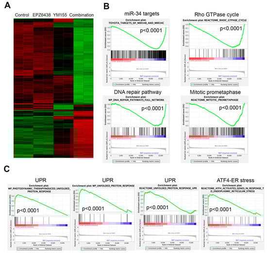 To understand the signaling pathways leading to the rapid cell killing by the combination of EZH2 inhibitors with YM155, we performed global gene expression profiling analysis after BE2C cells were treated with each individual agent or combination for 12 h. Since 5 nM of YM155 induced a comparable reduction in BIRC5 to 10 nM (Figure 3C), for the purport of reducing potential off-target effect as much as possible, we chose 5 nM of YM155. The results demonstrated that the combination induced dramatic changes in gene expression, while no obvious transcriptomic alterations were observed for EZH2 inhibitor alone after 12 h treatment although YM155 induced mild changes (Figure 5A). GSEA analysis revealed that the genes downregulated by the combination treatment were significantly enriched with miR-34 targets, leading to the conclusion that these genes may be rewired to the targets of miR-34. Other top downregulated pathways by the combination were involved in Rho GTPase cycle, DNA repair and mitosis (Figure 5B), all of which are essential to cell survival. Pathways significantly upregulated by the combination were unfolded protein response (UPR) and ATF4-mediated endoplasmic reticulum stress (Figure 5C). It is well known that ATF4 is a key player of UPR and cell death [61]. These data indicate that the combination of EZH2 inhibitors with YM155 perturbed multiple signaling pathways essential to cell survival, warranting further studies in the future.