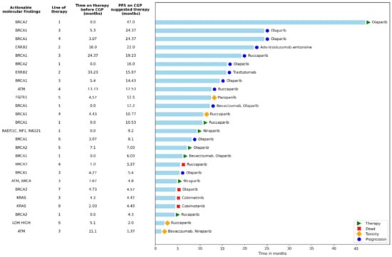 CGP testing was associated with improved patient survival compared to patients who were not referred to CGP. Furthermore, patients treated with CGP-suggested therapies had longer median OS than those who received non-personalized treatments, although this is not conclusive. However, the difference in OS between the group of patients treated with matched therapies and those who did not, may have also been affected by the OS of 24% (20/82) of patients who did not receive CGP-matched therapy but received PARP inhibitors prior to undergoing CGP.