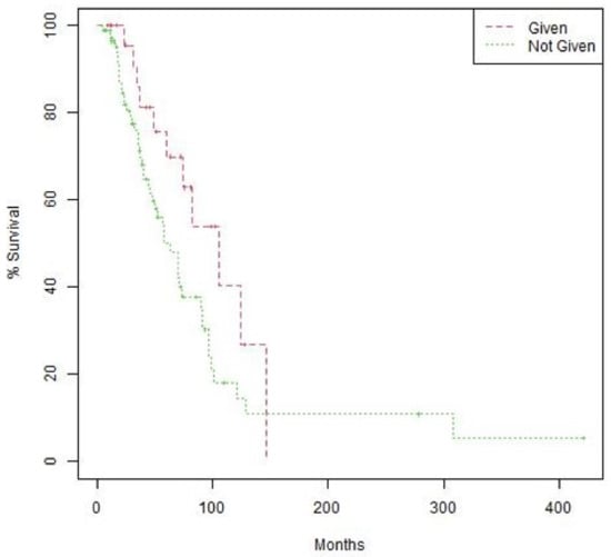 Overall survival (OS) by treatment with CGP-suggested therapy. Kaplan–Meier curves comparing OS of patients treated with therapies suggested by CGP vs. those who were not treated by CGP-suggested therapies. OS = 105.5 months (95% CI 74.4-not reached) vs. 63.6 months (95% CI 48.2–90.9). Log-rank p value 0.066.