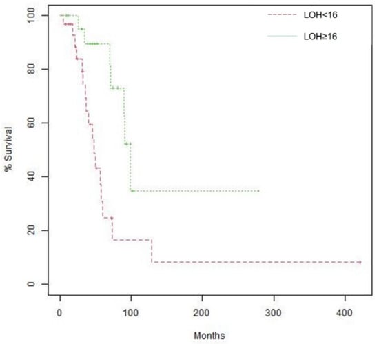 Kaplan–Meier curves of overall survival (OS) according to LOH, Median OS is 48.2 months (95% confidence interval [CI], 36.4 –129.3) for patients with LOH < 16 vs. 99.0 months (95% CI, 90.3—not reached) for patients with LOH ≥ 16. Log-rank p value 0.004.