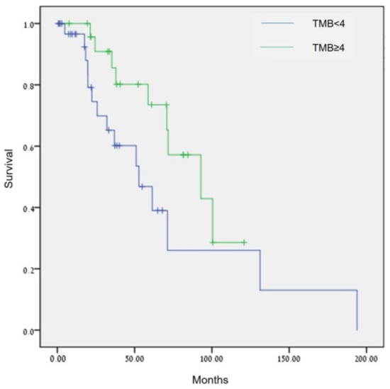 Sixty-six patients had information on TMB status: 75.8% (50/66) had low TMB status (<5 mut/Mb), and 24.2% (16/66) had intermediate TMB status (5–15 mut/Mb). None had high TMB status. Analysis of TMB using the Breslow test showed patients with TMB ≥ 4 mut/Mb had a statistically significant longer OS compared with patients with TMB < 4 mut/Mb (92.8 months [95%CI, 47.1–138.6] vs. 52.77 months [95% CI, 26.4–79.2], p = 0.026, Figure 4).
