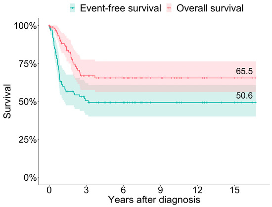 The median duration of the follow-up was 2.6 years (with a range of 0–16.7) and a mean duration of 4.5 years. The three-year OS and EFS estimates were 65.5% and 50.6% (Figure 2).