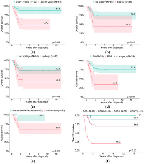 Probabilities of overall survival relating to age (a), initial biopsy (b), tumor spillage (c), tumor resection status (d), five-item microscopic score (e), and COG stage (f).