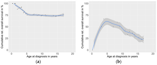 The Cox regression determined that the risk of death was 8-fold higher for a tumor volume of ≥200 mL compared to that of <200 mL (p < 0.001). The overall survival of patients with COG stage III decreased linearly by 1.5% per year of age at diagnosis (R2 = 0.662, p < 0.001) and in stage IV patients by 2.9% (starting at 3.2 years of age; R2 = 0.850, p < 0.001) (Figure 4).