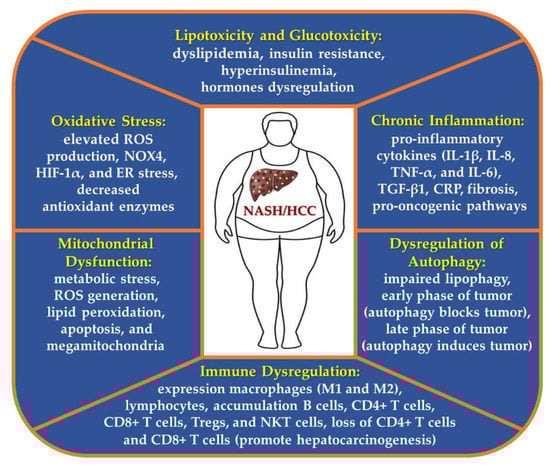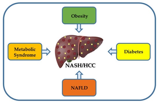 Nonalcoholic steatohepatitis (NASH) was first described in 1980 and is the inflammatory subtype of non-alcoholic fatty liver disease (NAFLD), with steatosis as well as evidence of hepatocyte injury (ballooning and lobular inflammation), with or without fibrosis [1]. Obesity and type 2 diabetes (T2D), both pandemics in the world, probably increase the prevalence of NASH and complications such as cirrhosis and hepatocellular carcinoma (HCC) [2]. In addition, the prevalence of metabolic risk factors for NASH and HCC, including metabolic syndrome and NAFLD are increasing and may jointly become the main cause of HCC worldwide. Several comorbidities have been associated with obesity such as hypertension, which was increased in NASH-HCC, and also a higher rate of myocardial infarction and apoplectic stroke was reported among NASH-HCC patients [3]. Excessive hepatic fat accumulation in obese individuals is closely related to insulin resistance, diabetes, and dyslipidemia, thereby predisposing to the development of NASH and HCC [4]. HCC represents approximately 75–85% of primary liver cancers, being one of the most lethal and prevalent human cancers [5,6], and its pathogenesis is highly complex and heterogeneous, including genetic mutations, genetic disorders in the form of polymorphisms, epigenetic modifications, metabolic reprogramming (alterations in metabolic pathways), as well as oxidative stress, endoplasmic reticulum (ER) stress, inflammation, altered production of cytokines and adipokines, and mitochondrial dysfunction, which most of these molecular mechanisms, have been proposed in the etiology of NASH [7,8]. Oxidative stress is a critical hit in NASH pathogenesis (contributes to hepatic inflammation and fibrosis) and along with dysregulation of glucose and lipid metabolism continues throughout the entire oncogenic processes [1,9]. Furthermore, CD8+ T-cells and NKT-cells have been demonstrated to cooperatively promote liver damage and carcinogenesis through interaction with hepatocytes in a NASH-mouse model [10]. Other mechanisms are involved in obesity-derived hepatocarcinogenesis, including alterations in the signaling pathways of IL-6, PTEN, NF-κB, Hedgehog, TNF-α, and STAT3 [11,12]. Together, biological processes altered and these signaling pathways lead to the activation of pro-oncogenic pathways and suppression of anti-oncogenic pathways [8].