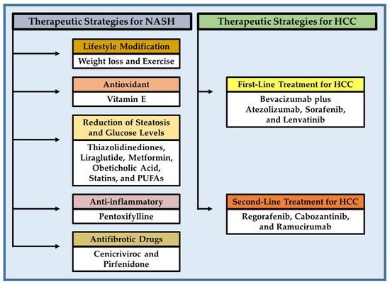 NASH and HCC are serious public health problems, and most patients are diagnosed at an advanced stage due to the complexity and diversity of drivers implicated in the development and progression of the disease. Therefore, systemic therapies are commonly recommended as the standard of medical care [6]. NASH can be partially reversed with weight loss and exercise through a combination of diet and general lifestyle changes [13]. In addition, several therapeutic drugs have been investigated with varying degrees of success, which were addressed to reduce lipid and glucose levels as well as to suppress pathological processes involved in NASH. Frontline systemic therapy of advanced HCC is constantly changing. Sorafenib, a multikinase inhibitor, was introduced in 2007 for the treatment of HCC and was the only validated treatment for many years. In 2020, the combination of atezolizumab with bevacizumab showed superiority to sorafenib alone in survival, making it the gold-standard first-line therapy. Regorafenib and lenvatinib, other multikinase inhibitors, were also approved by the United States Food and Drug Administration (FDA) in the second and first-line settings, respectively [14,15]. This review provides an update on the genetic and risk factors, as well as pathophysiology, metabolic reprogramming, and epigenetic alterations involved in the transition from NASH to HCC, and briefly summarizes current therapeutic and pharmacological strategies for the treatment of NASH and HCC derived by obesity.