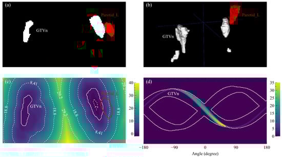 where V is the voxel volume of the OAR, and is the angle from GTVn surface point to OAR voxel point on the axial plane. POV histogram is calculated by summing up the masked OAR sinogram along the angle direction. The masked OAR sinogram is the modified radon transform of the OAR mask volume around the axial axis; only the voxels located before GTVn are counted for each OAR mask volume projection. One Parotid_L masked sinogram is shown in Figure 1d.