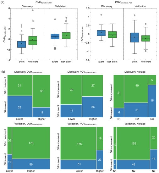 Continuous and binarized spatial factor distributions and N stage distributions for 3-year disease progressed and non-disease progressed patients in the discovery and validation cohort. (a) Box plots of continuous spatial factor distributions. Patients with disease progression within three years had lower mean OVH principle values and higher mean POV principle values at both discovery and validation. (b) Mosaic plots of the binarized spatial factor and N stage distributions of patients with and without 3-year disease progression.