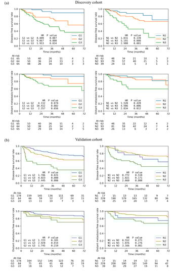Kaplan–Meier curves of the low-(G1), median-(G2), and high-risk (G3) patient groups based on the new spatial index and the three N stages on (a) disease-free survival and (b) distant metastasis-free survival. Each plot also contains the hazard ratio (HR) and the corresponding p-value between each two groups.