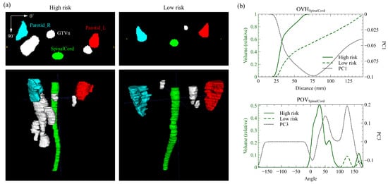 To further explain the contribution of the two anatomical factors in better identifying the risk of disease progression, we selected two representative cases from the discovery cohort with the same N stage but distinct risks based on the spatial index. The high-risk patient was classified as G1 and the low-risk one as G3, both having the same N stage (N2) and chemotherapy strategy (CCRT + ACT). The high-risk patient developed distant metastases at 32.3 months, while the low-risk patient showed no signs of disease progression for at least 34.3 months. Figure 4a presents the 2D axial masks and the 3D volumes of GTVn and three OARs for the high and low-risk patient. Anatomically, both patients had metastatic retropharyngeal LN, but a significantly larger extent of the right cervical LN tumor was observed in the high-risk patient. Meanwhile, distinct patterns of the spinal OVH and POV curves were found, as drawn in Figure 4b, where the selected PC vectors were also included. The OVH curve of the high-risk patient was significantly higher than that of the low-risk patient with the largest overlap volume difference emphasized at around the global minimum (~75 mm) of the first PC vector. The POV at the first local maximum (~25 degrees) of the PC vector was much higher in the high-risk patient, exceeding the higher POV of the low-risk patient at the second local maximum (~125 degrees).