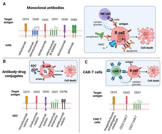 Targeted immunotherapies in DLBCL investigated on cellular models. (A) Monoclonal antibodies (mAbs); (B) Antibody-drug conjugates (ADCs); (C) chimeric antigen receptor T cells (CAR T-cells). Created with BioRender.com, accessed on 30 October 2022.