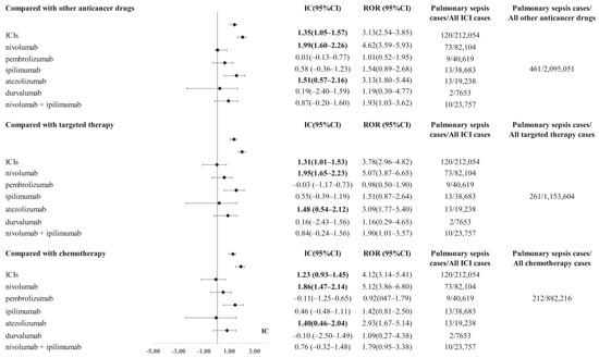 Then, we assessed the robustness of the association of pulmonary sepsis with ICIs (nivolumab, pembrolizumab, ipilimumab, atezolizumab, durvalumab, nivolumab plus ipilimumab were included in the subsequent analysis because the case number of dostarlimab, avelumab, and cemiplimab is less than 5). When compared with other anti-cancer drugs, overall ICIs (ROR025 2.50, IC025 1.03, p < 0.001), nivolumab (ROR025 3.59, IC025 1.60, p < 0.001), atezolizumab (ROR025 1.80, IC025 0.57, p < 0.001) showed a significant safety concern of pulmonary sepsis. When compared with targeted therapy (such as tyrosine kinase inhibitors) or chemotherapy extracted from NCCN’s guideline, overall ICIs, nivolumab, and atezolizumab still have a significant signal of pulmonary sepsis (ROR025 > 1, IC025 > 0, p < 0.001) (Figure 1).