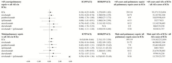 120 cases of pulmonary sepsis were detected in patients on ICIs. A total of 73 of 120 (60.8%) cases were from patients on nivolumab. A total of 85.8% of cases were reported during 2018–2021. A total of 83 of 120 (69.2%) pulmonary sepsis cases were reported by health professionals such as doctors or pharmacists. Regarding indications, 40 of 120 (33.3%) cases were reported as lung cancer. A total of 48 of 120 (40.0%) pulmonary sepsis cases received ICIs and glucocorticoids/corticosteroids, and 44 of 120 (36.7%) cases received proton pump inhibitors during ICIs therapies (Table 2). After comparing the age of pulmonary sepsis (age of more than 65) associated with ICIs against the same age range of any reported adverse events of this drug class, we did not detect any difference of signals among various age periods. Although, the overall ICIs (IC025 0.06, p < 0.001) showed that males have a higher safety concern of pulmonary sepsis than females. However, we did not find any difference of pulmonary sepsis signals between males and females for any specific kind of ICIs (Figure 2). A total of 82 of 120 (68.3%) cases suffering from pulmonary sepsis progressed to death for patients on ICIs. A total of 31 of 120 (25.8%) cases experienced a life-threatening situation.