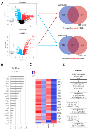 Bioinformatics analysis used to identify liver-metastasis-related genes. (A) Volcano plots of DEGs generated from data serials GSE42952 and GSE71729. Overlapping DEGs of up-regulated and down-regulated DEGs obtained via Venn diagrams. (B) Expressions of 29 candidate DEGs in cell lines of pancreatic cancer. (C) Heatmap of 29 candidate DEGs. Met A and Pri A represent liver metastasis and primary tumors of GSE71729. Met B and Pri B represent liver metastasis and primary tumors of GSE42952. (D) Flowchart of bioinformatics analysis.